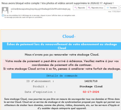 Le mail vous avertit d’un échec de paiement pour le « renouvellement de votre stockage Cloud », et que sans ça, vous ne pourrez plus sauvegarder vos données.