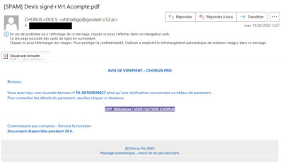Très utilisée contre les entreprises, associations et indépendants. Le mail vous indique un devis signé avec le numéro d’une facture ( fictive ), avec très souvent une pièce jointe.
