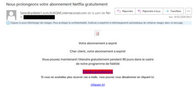 Le mail contient un bouton intitulé « Mettre à jour votre moyen de paiement », mais le lien mène vers un faux site Netflix qui vole vos identifiants et vos coordonnées bancaires.