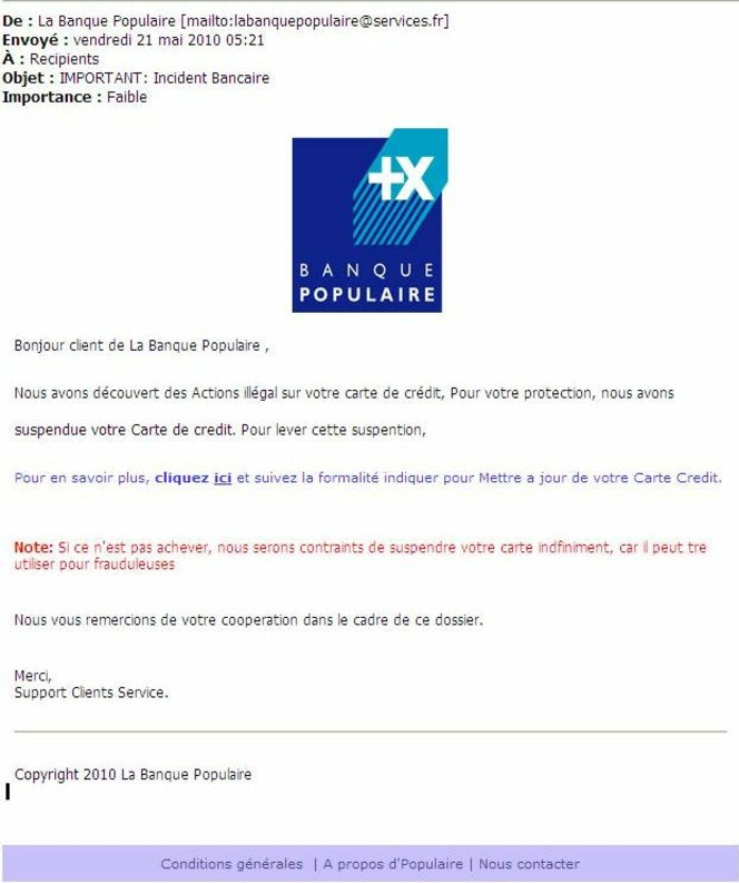 Le mail contient un lien qui vous renvoie sur un faux site, et vous incitant à saisir vos informations bancaires.